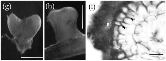 Figure 3. The ectomycorrhizal (ECM) formation process between P. massoniana and S. bovinus. (a,b) At 7 days post-inoculation (dpi): scale bars = 5 mm and 500 µm, respectively. The white arrow indicates hyphae wrapped around the root system; black arrows indicate the intercellular mycelium. (c,d) At 14 dpi: scale bars = 1 mm and 100 µm, respectively. The white arrow indicates hyphae wrapped around the root system; black arrows indicate the developing Hartig net. (e,f) At 21 dpi: scale bars = 1 mm and 50 µm, respectively. The white arrow in (e) indicates hyphae wrapped around the root system. The white arrow in (f) indicates the developing mantle and black arrows indicate the Hartig net. (gi) At 28 dpi: scale bars = 1 mm, 500 μm, and 50 μm, respectively. (g) Dichotomous branching hypha, (h) swollen hypha. (i) Cross-section of the root: the white arrow indicates the mantle and black arrows indicate the Hartig net.