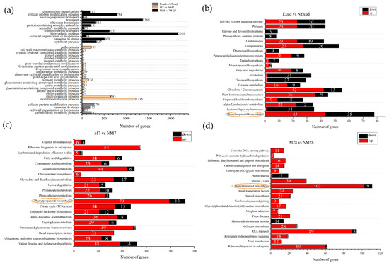 Figure 5. Enrichment of DEGs. (a) Enriched Gene Ontology biological processes. (bd) Kyoto Encyclopedia of Genes and Genome enrichment for Exud vs. NExud, M7 vs. NM7, and M28 vs. NM28. The numbers shown on the red and black bars indicate the number of upregulated and downregulated DEGs, respectively. The phenylpropanoid biosynthesis pathway (circled) was common to all three symbiosis stages.