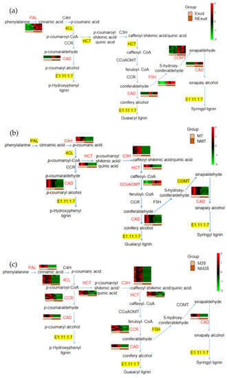 Figure 6. Phenylpropanoid biosynthesis pathway with heatmaps showing fold changes in the expression of genes encoding key enzymes in this pathway. (a) Exud vs. NExud; (b) M7 vs. NM7; (c) M28 vs. NM28. Key enzymes encoded by DEGs that were annotated in metabolic pathways are shown in red. An enzyme highlighted in yellow indicates that both upregulated and downregulated genes encode the enzyme. An enzyme that is not highlighted in yellow indicates that no genes encoding the enzyme were annotated. Enzymes: PAL, phenylalanine ammonia-lyase; C4H, cinnamate 4-hydroxylase; 4CL, 4-coumarate:CoA ligase; HCT, hydroxycinnamoyl-CoA shikimate/quinate transferase; C3H, coumarate 3-hydroxylase; CCoAOMT, caffeoyl-CoA-O-methyltransferase; CCR, cinnamoyl CoA reductase; F5H, ferulate 5-hydroxylase; COMT, caffeic acid O-methyltransferase; CAD, cinnamyl alcohol dehydrogenase.