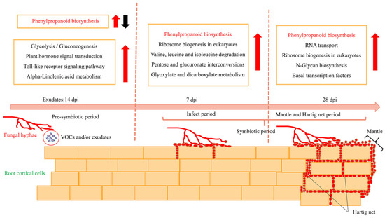 Figure 9. Schematic diagram showing morphological and transcriptional changes in a P. massoniana root during the formation of an ECM symbiosis with S. bovinus. Red arrows indicate upregulation; black arrow indicates downregulation. The phenylpropanoid biosynthesis pathway is common to all three ECM stages.