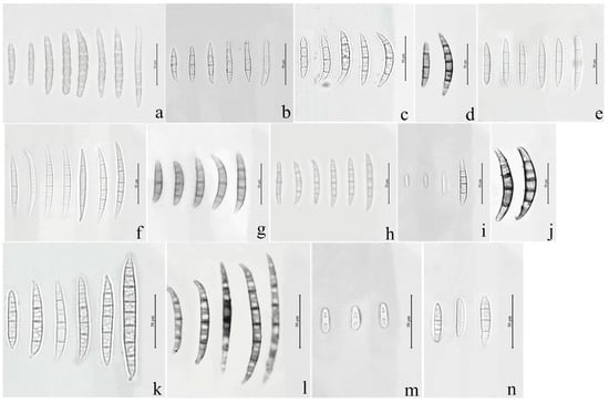 Macroconidia or microconidia of representative isolates of 14 Fusarium species. (a) F. compactum; (b) F. ipomoeae; (c) F. citri; (d) F. flagelliforme; (e) F. temperatum; (f) F. acuminatum; (g) F. armeniacum; (h) F. asiaticum; (i) F. annulatum; (j) Fusarium sp.; (k); F. graminearum; (l) F. glycines; (m) F. verticillioides; (n) F. sporotrichioides.