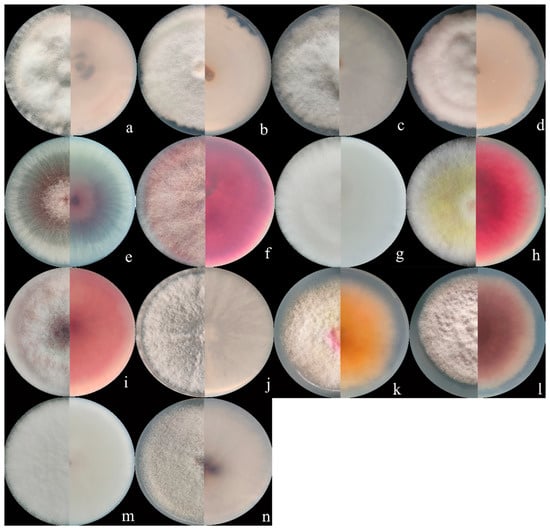 Colony appearance of representative isolates of 14 Fusarium species. (a) F. compactum; (b) F. ipomoeae; (c) F. citri; (d) F. flagelliforme; (e) F. verticillioides (f) F. sporotrichioides; (g) F. armeniacum; (h) F. asiaticum; (i) F. graminearum; (j) Fusarium sp.; (k) F. acuminatum; (l) F. glycines; (m) F. annulatum; (n) F. temperatum.