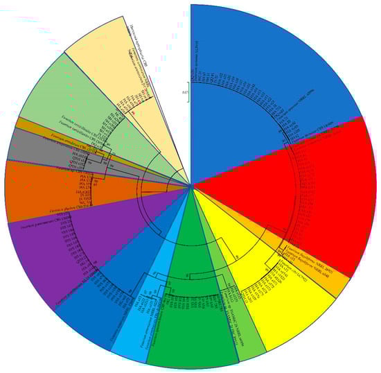 - Kumar, S.; Stecher, G.; Tamura, K. MEGA7: Molecular evolutionary genetics analysis version 7.0 for bigger datasets. Mol. Biol. Evol. 2016, 33, 1870–1874. [Google Scholar] [CrossRef]