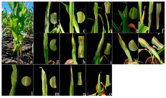 Disease severity (DS) and disease incidence (DI) were assessed 14 days post-inoculation. DS was measured based on a 0–9 scale described by Rafael et al. [26] and Xu et al. [25]: 0 (no visible symptoms), 1 (0 up to 0.5%), 2 (0.5–1.6%), 3 (1.6–5.0%), 4 (5.0–15%), 5 (15–37%), 6 (37–66%), 7 (66–87%), 8 (87% to 96%), and 9 (96–100%). DI was computed by following formula: DI = [100 × ∑ (n × corresponding DS)]/(N × 9), where n is the number of infected inoculation leaves corresponding to each disease rating, and N is the total number of inoculation leaves. Disease incidence was computed by following formula: disease incidence = number of diseased leaves/total number of inoculated leaves of living maize plants. A least significant difference (LSD) test was used for statistical analysis at a significance level of p < 0.05 with the Statistical Package for Social Sciences (SPSS) software (v. 20.0; SPSS Inc., Wacker Drive, Chicago, IL, USA, Illinois.IBM Corp., 2012. IBM). All re-isolated pathogens from inoculated maize leaves were identified using morphological and molecular methods mentioned above. Each experiment was repeated two times.