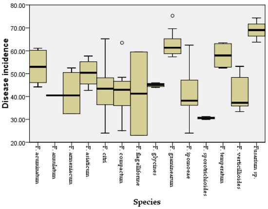 Disease incidence for maize leaves inoculated with different Fusarium species. Outliers are represented by a hollow circle.