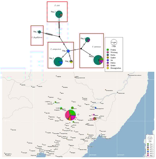 Haplotype networks were individually generated based on the tef1 gene sequences of 70 FIESC isolates (including 30 F. ipomoeae isolates, 25 F. compactum isolates, 13 F. citri isolates, and 2 F. flagelliforme isolates in the present study) using PopART v. 1.7 (Allan Wilson Centre Imaging Evolution Initiative) to evaluate genealogy pattens of the haplotypes [19]. The aligned haplotype sequences were used to construct a TCS network [30,31].