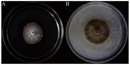 Colonies of strain SGSF723. (A) The 5-week-old colony on the PDA. (B) The 2-week-old colony on the OA.