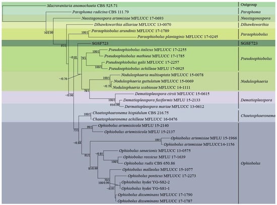 A multi-gene phylogenetic analysis for SGSF723 and 30 strains of their close species in Phaeosphaeriaceae (Pleosporales) were performed, and Macroventuria anomochaeta (Didymellaceae, Pleosporales) was used as an outgroup. The sequences were obtained from GenBank (Table S1) and aligned with MUSCLE [6,32]. A combined dataset of the four loci (ITS, LSU, SSU, and TEF) was produced. A maximum likelihood analysis (ML) of the dataset was performed in RaxmlGUI v2.0 [33,34] using a generalized time reversible (GTR) substitution along with a Gamma distribution, and bootstrap was run in 1000 replicates. Markov chain Monte Carlo (MCMC) has been used to estimate the posterior probability (PP) by MrBayes v. 3.2.4. [35]. Four simultaneous Markov chains were operated for 1,000,000 generations (standard deviation of shared frequencies below 0.01) and the trees were sampled every 1000 generations. The trees were used to determine PP in the majority rule consensus tree [5].