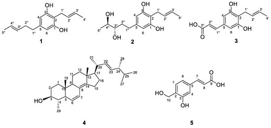 Compounds 4 and 5 were identified as two known compounds, 4α-methyl-ergosta-6,8(14),22-trien-3β-ol (4) and 3-(3-hydroxy-4-(hydroxymethyl) phenyl) acrylic acid (5). on the basis of their spectroscopic features (Supplementary Figures S16–S19) and by comparison with the published data in the literature [37,38].