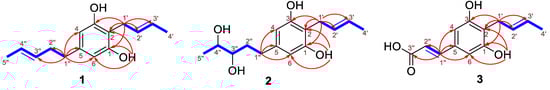 Key HMBC (red arrows) and 1H-1H COSY (blue-bold) correlations of compounds 1–3.