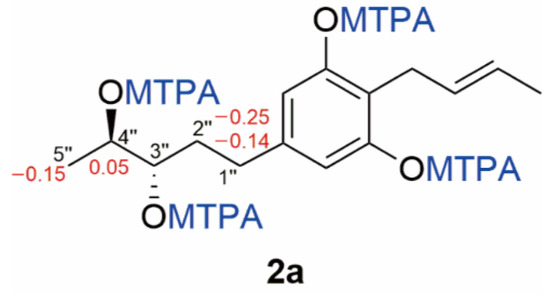 The structures and ΔδS-R values (in ppm) for MTPA esters 2a of compound 2.