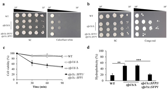 To test the possible connection between Sfp1 and CWI, cell wall properties were analyzed in the wild type (WT), sfp1Δ/Δ, and SFP1-reintegration strains. For the spot assay, cells were spotted onto agar plates with or without cell wall-disrupting agents congo red and calcofluor white. Congo red and calcofluor white bind to glucan and chitin respectively, and interfere with the synthesis and crosslinking of these polysaccharides [37]. As shown in Figure 1a,b, the sfp1Δ/Δ mutants were more resistant to congo red and calcofluor white than the WT and SFP1-reintegration strains. Moreover, cell sensitivity to zymolyase was also assessed. Zymolyase 100T is an enzyme mixture containing β-1,3-glucanase that degrades yeast cell wall polysaccharides, and zymolyase sensitivity reflects subtle differences in the cell wall β-glucan content. The results indicated that the sfp1Δ/Δ mutants were more resistant to zymolyase digestion (Figure 1c). Finally, CSH is associated with cell wall composition and architecture, cell adhesion, and biofilm formation in C. albicans [38,39]. Because the SFP1 gene deletion affects C. albicans adhesion and biofilm formation [24], CSH of the WT, sfp1Δ/Δ and SFP1-reintegration strains were thus compared. In Figure 1d, a significantly higher percentage of CSH was obtained in the sfp1Δ/Δ mutants than in the WT and the SFP1-reintegration strains.