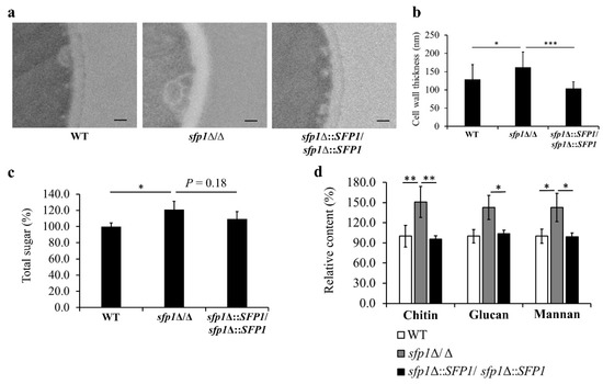 To further characterize the impact of SFP1 deletion on the cell wall, cells were examined by TEM and cell wall thickness was determined. Representative images and quantitative data were displayed in Figure 3a,b, separately. The results showed that cell wall thickness was increased by ~25% in the sfp1Δ/Δ mutant compared to the WT and SFP1-reintegration strains. To better understand the changes in cell wall caused by SFP1 deletion, cell wall polysaccharides were also quantified [33]. In Figure 3c, the total sugar content of cell wall was increased in the sfp1Δ/Δ mutant compared to the control strains. Moreover, the cell wall mannan, glucan, and chitin content was further assessed by HPAEC-PAD analysis, and was all largely increased in the sfp1Δ/Δ mutant compared to the control strains (Figure 3d). Interestingly, the increased cell wall content of polysaccharides is somehow consistent with the increased thickness of cell wall caused by the SFP1 gene deletion.