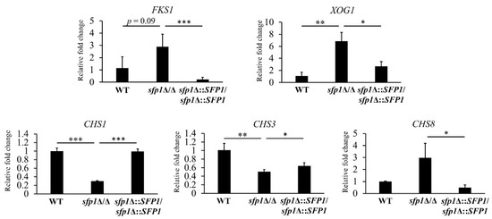 The cell wall integrity is maintained by remodeling through breaking and reforming chemical bonds between and within cell wall polysaccharides [41]. Different sugar synthases, hydrolases, and modification enzymes are involved in the cell wall remodeling process [14,42,43]. To determine whether Sfp1 can regulate genes related to cell wall biosynthesis and remodeling, expression of representative genes was detected using real-time qPCR.