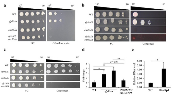 Based on the findings of this work and other studies, Sfp1 and Cas5 are both involved in C. albicans response to cell wall stress. Interestingly, the cas5Δ/Δ mutant shows hypersensitivity to cell wall-disrupting agents, including congo red and caspofungin [16]. Nevertheless, unlike Cas5, deletion of SFP1 leads to cell resistance to congo red, and calcofluor white (Figure 1a,b and Figure 2). According to these opposite phenotypes, determining whether a regulatory relationship exists between Sfp1 and Cas5 is therefore of interest. In order to address this question, the genetic relationship between Sfp1 and Cas5 in cell wall response was first established. For this purpose, the CAS5 gene was deleted in the WT (i.e., cas5Δ/Δ) and in the sfp1-deletion mutant (i.e., sfp1Δ/Δ cas5Δ/Δ), separately. Susceptibility of the WT, sfp1Δ/Δ, cas5Δ/Δ and sfp1Δ/Δ cas5Δ/Δ mutants to cell wall-disrupting agents was examined using the spot assay. As shown in Figure 5a–c, the sfp1Δ/Δ mutant was resistant to all the cell wall-disrupting agents tested, whereas the cas5Δ/Δ mutants exhibited a hypersensitive phenotype. Interestingly, like the cas5Δ/Δ mutant, the sfp1Δ/Δ cas5Δ/Δ double deletion mutants were also hypersensitive to all the drugs tested. Additionally, the caspofungin MICs were also determined. The MIC50 for the cas5Δ/Δ and sfp1Δ/Δ cas5Δ/Δ mutant was 0.031 and 0.0625 µg/mL, respectively. Moreover, the caspofungin MIC90 for the cas5Δ/Δ and sfp1Δ/Δ cas5Δ/Δ mutant was 0.031 and 0.125 µg/mL, respectively. These results indicated that both cas5Δ/Δ and sfp1Δ/Δ cas5Δ/Δ mutants required fewer amounts of caspofungin to inhibit 50% and 90% of cells compared to the WT, sfp1Δ/Δ, and SFP1-reintegration strains (as shown in Table 1). Together, the epistasis relationship of Sfp1 and Cas5 suggested that one may repress the function of the other in response to cell wall stress. Otherwise, Sfp1 and Cas5 may function independently, but not coordinately.