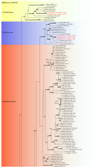 We used concatenated sequence data combining the ITS, BenA, CaM and RPB2 regions for defining relationships within subgenus Nidulantes. The total length of the aligned data set was 2772 characters, containing 626, 576, 651, and 919 bp for ITS, BenA, CaM, and RPB2 respectively. K2P + G model was used for ITS, GTR+G model was used for BenA, CaM and RPB2. The alignment sequences and the tree file were deposited in TreeBASE (S29781, https://www.treebase.org accessed on 14 October 2022).