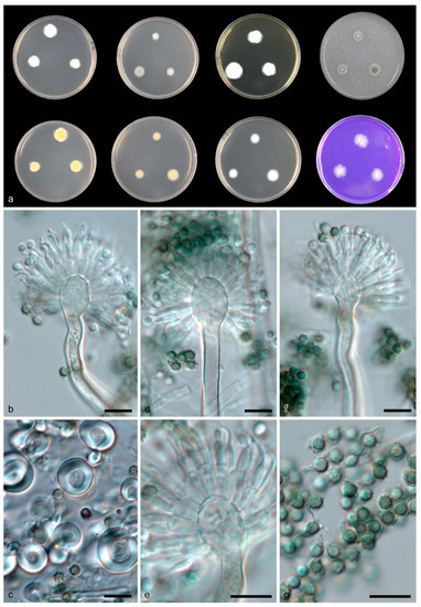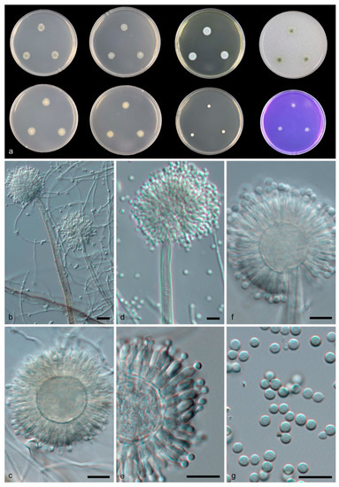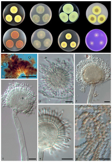 Aspergillus sichuanensis CGMCC 3.19705 T. (a) Colonies: top row left to right, obverse CYA, obverse MEA, YES and OA; bottom row left to right, reverse CYA, reverse MEA, DG18 and CREA. (b,d–f) Conidiophores. (c) Hülle cells. (g) Conidia. Scale bars: (b–g) = 10 μm.
