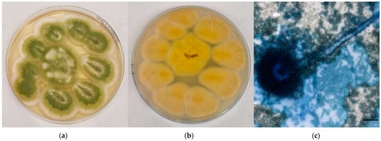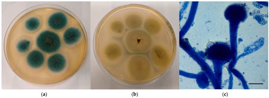 Mycological examination of the colonies referable to A. flavus complex grown onto CZA. (a) Macroscopic surface of the colonies; (b) Macroscopic reverse of the colonies; (c) Microscopic features of the colonies (methylene blue staining, ×40, bar 20 µm).