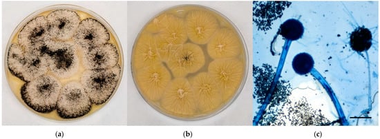Young sterile colonies referable to black aspergilli appeared white-yellow in colour at maturity, covered by a layer of black conidial heads with a cream-colored reverse; the surface was grainy and edged in white (Figure 3a,b). Microscopically, hyphae hyaline and septate, smooth conidiophores with a tick wall, spherical vesicles with phialides originating from metulae on the entire vesicle surface, spherical/oval rough conidia were observed (Figure 3c).