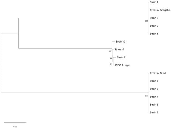 Neighbor-Joining phylogenetic tree of the sequenced Aspergillus strains. Maximum Composite Likelihood method, 1000 bootstraps (MEGA11 Software).