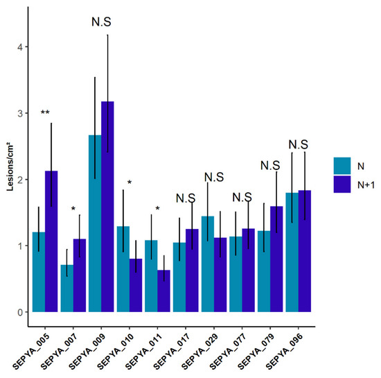 The rice blast symptoms analysis after differential fertilization showed a genotype x treatment interaction effect (0.00168 **). In particular, among the ten genotypes tested, two genotypes (SEPYA_005 and SEPYA_007) were significantly more susceptible in the N+1 condition, with an increase of 77% (and, respectively, 54%) in the number of lesions per surface (Figure 1). In contrast, two other genotypes (SEPYA_010 and SEPYA_011) showed an increased resistance in the N+1 condition. The other six genotypes were not significantly impacted by nitrogen fertilization, confirming our previous results that nitrogen-induced susceptibility is a relatively rare phenotype in rice temperate japonica [17].