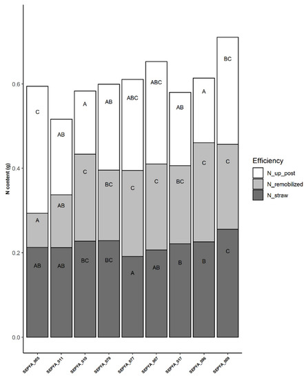 Diversity of nitrogen uptake and utilization in a panel of nine genotypes. Nitrogen uptake and partitioning between remobilized and fixed N share in straws. The sum of the remobilized nitrogen share and the fixed nitrogen share in mature straws is the pre-flower nitrogen uptake. The groups are derived from post-hoc tests performed on the model described in Materials and Methods, and are calculated by modality. N_straw: amount of nitrogen remaining in the straw at harvest, N_remobilized: amount of nitrogen remobilized, N_up_post: amount of nitrogen removed after flowering. The repetition of the data was not sufficient for SEPYA_029, which is not represented here. Letter categories have been established with post hoc test done with the linear model described in methods with a Tukey adjustment. Two bars of the same color with the same letter indicate no significant (p < 0.05) difference between component values.