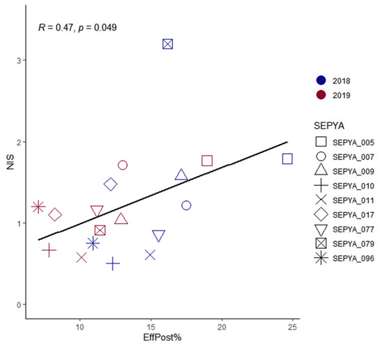 Relationship between NIS and the nitrogen-uptake efficiency after flowering. Each point represents the NIS value estimated from the susceptibility data as well as the amount of nitrogen removed after flowering. The points circled in blue are the 2018 estimates, and those circled in red are the 2019 estimates. The correlation value was determined using Pearson’s method.