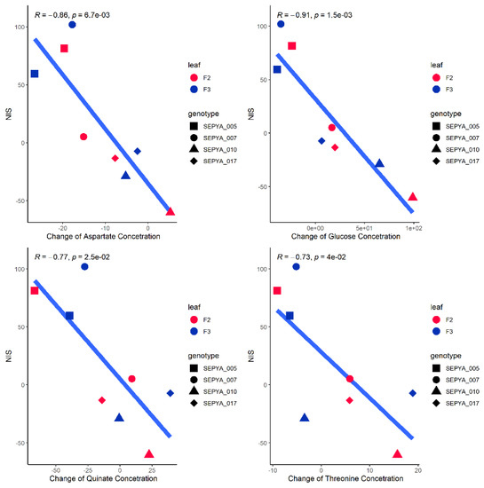 Relationships between nutrient drop and metabolite concentration changes following nitrogen supply and NIS. Correlation between changes in aspartate (top left), glucose (top right), quinate (bottom left), and threonine (bottom right) levels following nitrogen supply and NIS. Red dots are from measurements of F2 leaves, and blue dots are from F3 leaves. Correlations and significance were calculated using Pearson’s method.