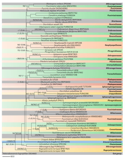 Skierka has long held an isolated placement within Pucciniales. Arthur [15,16] placed Skierka in a separate subfamily or tribe, respectively, in the Pucciniaceae; while Cummins and Hiratsuka [1] treated it as incertae sedis within the rusts. Mains [20] hypothesized that Skierka represented an intermediate taxon between Melampsoraceae and Pucciniaceae (equivalent to the subordinate ranks Melampsorineae and Raveneliineae/Uredinineae, under the present classification). However, with the incorporation of DNA-based molecular studies in addition to basic morpho-taxonomy, this genus has now gained a definite placement in the order Pucciniales. A general outline of rust fungi is presented here (Table 3 and Figure 2) to understand the accurate taxonomic position of the rust genus Skierka.