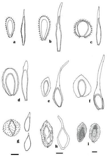 Uredospores and teliospores (line diagrams) different Skierka spp. (a) S. congensis Henn; (b) S. philippinensis Mains; (c) S. canarii Racib; (d) S. cristata Mains; (e) S. petchii (Syd.) Mains; (f) S. holwayi Arthur; (g) S. nephelii S. Ito and Muray; (h) S. divinopolensis Dianese; (i) S. agallochae Racib. Redrawn references [20,25,28,31,34]. Scale bars = 20 μm.