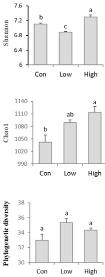Alpha diversity analysis of the AMF communities in rhizospheric soil. The Shannon diversity, richness (Chao1), OTU number, and phylogenetic diversity among the different treatments were investigated and compared. Con—no treatment; Low—biogas slurry (250 m3 ha−1 yr−1) treatment; High—biogas slurry (375 m3 ha−1 yr−1) treatment. Error bars represent the standard errors of three replications. Different lowercase letters represent significant (p < 0.05) differences between treatments (n = 3).