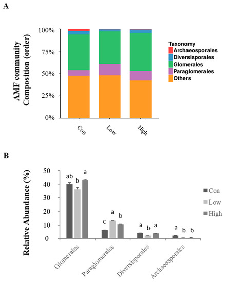 Relative abundance of the AMF community composition in rhizospheric soil at the order level. (A) The distributions of AMF community compositions at the order level. (B) Relative abundance of the AMF community composition at the order level. Con—no treatment; Low—biogas slurry (250 m3 ha−1 yr−1) treatment; High—biogas slurry (375 m3 ha−1 yr−1) treatment. Error bars represent the standard errors of three replications. Significant (p < 0.05) differences between the treatments are shown by different lowercase letters.