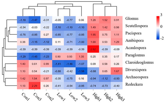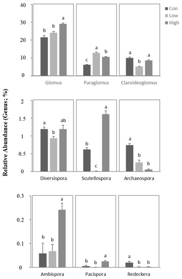 Relative abundance of the AMF community composition in rhizospheric soil at the genus level. Con—no treatment (control); Low—biogas slurry (250 m3 ha−1 yr−1) treatment; High—biogas slurry (375 m3 ha−1 yr−1) treatment. Error bars represent the standard errors of three replications. Different lowercase letters indicate significant (p < 0.05) differences between the treatments.