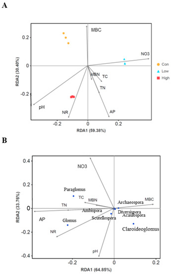 Redundancy analysis (RDA) between the AMF community composition in rhizospheric soil and environmental factors in poplar plantations treated with different concentrations of BS. (A) The RDA showed the relationship between the AMF community compositions based on the OTU abundance and environmental factors. (B) RDA for the correlations between AMF genera and environmental factors. Eight environmental factors were investigated for their correlations with AMF community composition. Abbreviations: MBC, microbial biomass carbon in rhizospheric soil; MBN, microbial biomass nitrogen in rhizospheric soil; TC, total carbon; TN, total nitrogen; NO3—, nitrate–nitrogen; AP, available phosphorus; NR, nitrate reductase.