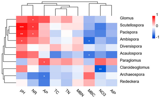 RDA was used to further test the correlations between some major AMF genera and environmental factors (Figure 5B). The two axes of the ordination in the RDA explained the genus–environment relationship by 64.85% and 33.76%, respectively. The dominant genus, Glomus, displayed a positive correlation with NR, AP, and pH, while Paraglomus was positively correlated with NO3−N, AP, TN, and NR. The third most dominant genus, Claroideoglomus, showed a positive correlation with MBC and pH (Figure 5B). A further heatmap analysis based on the relationship of the AMF genera with the environmental factors revealed that: Scutellospora, Ambispora, and Pacispora had a significantly (p < 0.05) positive correlation with pH; Glomus, Scutellospora, and Pacispora were also significantly (p < 0.05) positively correlated with NR activity; Ambispora, Acaulospora, and Claroideoglomus displayed a significantly negative correlation with MBC and NO3−N, respectively. In addition, Paraglomus exhibited a significantly positive correlation with AP, whereas Archaeospora was strongly negatively correlated with AP (Figure 6).