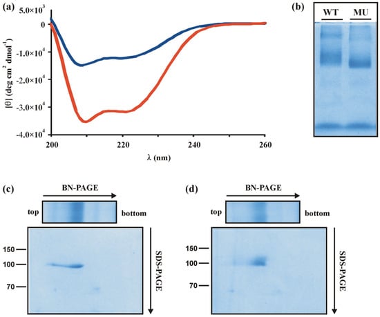 Recently, it was demonstrated that a mutation in the main transactivator Xyr1, namely a A824V transition, leads to a glucose blind, (hemi)cellulase-expressing phenotype [10]. Generally, transcript formation in the mutant strain seems to be carbon source-independent or non-responsive. As Derntl and co-workers reported that the mutation is located in the α-helices-rich, C-terminal part of the domain that might lead to structural changes of the protein, we investigated this assumption by employing CD spectroscopy. Therefore, the wild-type Xyr1 and the Xyr1A824V were heterologously expressed in E. coli. The spectrum of the negative ellipticity strongly differed between the wild-type Xyr1 and the Xyr1A824V (Figure 1a), thus, demonstrating that these proteins vary in their secondary structure. The mutation A824V resulted in a 61% decrease in mean residue ellipticity at 222 nm and a strong decrease in the fraction of residues involved in helical conformation, hence, indicating a possible role of this region for a specific folding of Xyr1. A BN-PAGE of both Xyr1 variants revealed that both of them are present as monomers (strong bands in the middle of the BN-PAGE) and homodimers (fainter, upper bands in the BN-PAGE) in comparable ratios (Figure 1b). A subsequent SDS-PAGE provided evidence that all bands are different agglomerations of the Xyr1 protein (104 kDa) (Figure 1c,d). Therefore, a different protein–protein interaction of the two variants is not responsible for the different CD spectra. Moreover, the observation that both monomer and dimer migration differed between Xyr1 and Xyr1A824V (Figure 1b) supports the assumption of a structural change caused by the point mutation.