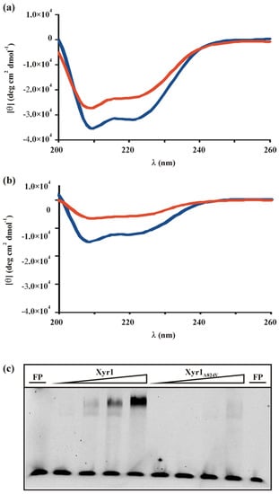 Analyses of Xyr1 and Xyr1A824V binding to target DNA. Far-UV spectra (200–260 nm) of a CD spectroscopy analysis of Xyr1 (a) or Xyr1A824V (b) alone (blue lines) and their respective protein–DNA complexes (red lines) using a xyn1 URR fragment (−430 to −396 bp from ATG) in a molar ratio of 1:1. Data were plotted after correction for the contribution of the DNA. (c) EMSA analysis of Xyr1 and Xyr1A824V DNA-binding behaviour using increasing amounts of protein (170 ng, 340 ng, 680 ng, and 1360 ng, respectively) and a fluorescently labelled xyn1 URR fragment. FP, free probe.