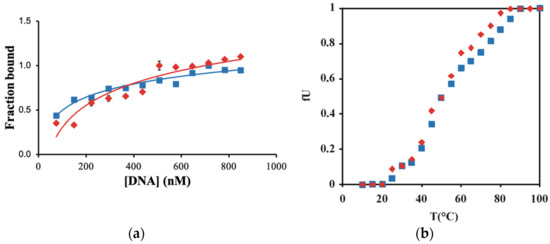 Circular dichroism (CD) spectroscopy is very useful for the characterisation of the protein secondary structure (in % α-helix, β-sheets, turns), as well as structural changes resulting from DNA–protein, protein–protein or protein–ligand interactions (e.g., reviewed by [17,18]). Especially in the case of transcription factors, this method is used to investigate the influence of DNA-binding on the protein and DNA structure, an example of which is the investigation into structural changes of the transcription factor NF-κB induced by DNA binding [19].