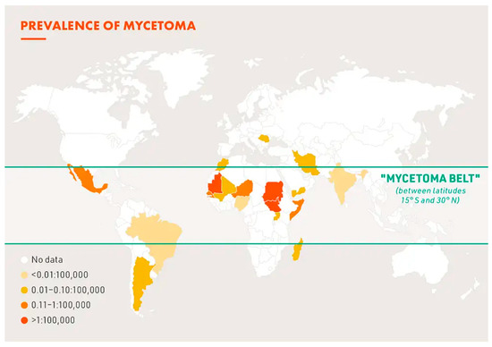 - Emery, D.; Denning, D.W. The global distribution of actinomycetoma and eumycetoma. PLoS Negl. Trop. Dis. 2020, 14, e0008397. [Google Scholar] [CrossRef] [PubMed]
