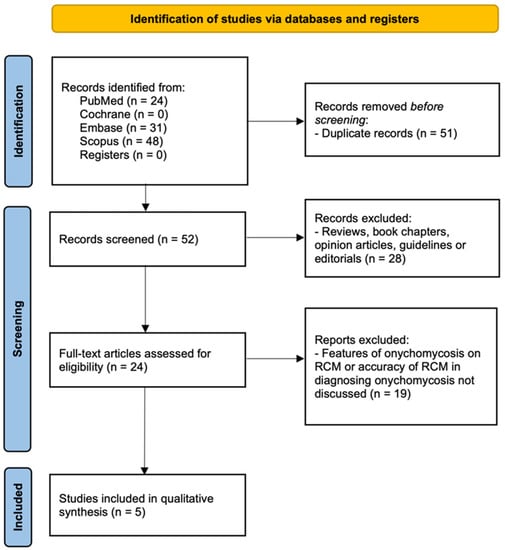 A total of 103 articles were found across the four databases, of which 51 were duplicates (Figure 1). Twenty-four studies were full-text articles, and five of them reported RCM features of onychomycosis (Table 2) [7,8,9,10,11]. The risk of bias in the index test in two articles [9,11] was deemed high; Pharaon et al. used two different RCM devices and Krammer et al. used an acridine orange dye and a fluorescence filter to examine nail specimens. The risk of bias across the other domains of the included articles was deemed to be low (Figure 2).