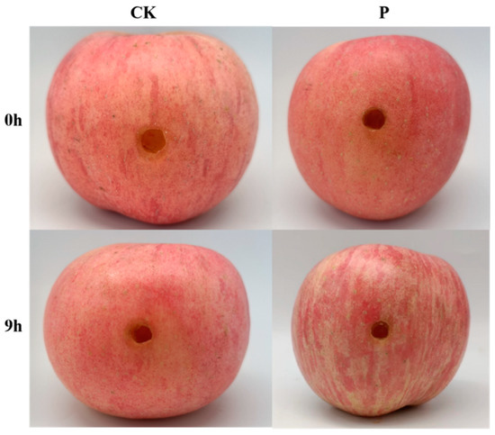 The phenotype of apple inoculated at 0 h and 9 h in control and experimental groups.