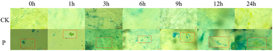 Samples were taken, and wounds were made at different time points during P. expansum infection. It was found by microscope observation that 1 h after inoculation with the bacterial suspension, mold spores began to change from an oval shape to a shape with a tip. Then, 3 h after inoculation with the bacterial suspension, spore deformation was obvious, and budding tubes emerged. Then, 6 h after inoculation with the bacterial suspension, the budding tubes of conidia directly invaded the apple tissue, and the tails of some conidia expanded and formed appressorium. After 9 h inoculation with the bacterial suspension, the infecting nails grew on the appressorium and infected the apple tissue. The bud tube extended into the apple tissue and continued to infect the apple tissue. Then, 12 h after inoculation, primary hyphae continued to extend into apple tissues. After inoculation with the bacterial suspension for 24 h, new spores were formed on the secondary mycelia. At 9 h after inoculation, P. expansum successfully infected apples, so the sampling time was determined to be 9 h (Figure 1 and Figure 2).