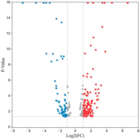 A total of 4164 proteins were identified in the P. expansum infected and non-infected apple samples. In the quantitative results, the screening for significantly expressed differential proteins was based on FC > 1.5 or FC < 0.67 and p < 0.05. The results showed that a total of 343 differential proteins were screened. Among them, 131 proteins were downregulated and 212 proteins were upregulated. Functional annotation and enrichment analysis were performed for all differentially expressed proteins. Figure 3 shows volcano plot of the differentially expressed proteins, where the upregulated proteins are in red and the downregulated proteins are in blue.