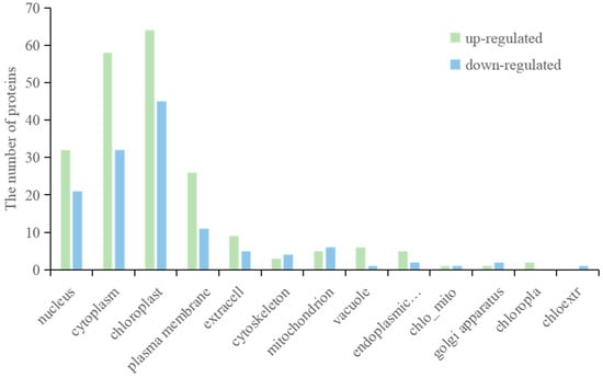 Studying the mechanisms and patterns of protein localization in cells and predicting the subcellular localization of proteins are important for understanding protein structure, properties, functions, and protein interactions. In this study, it can be seen from the prediction results of subcellular localization that the differentially expressed proteins are mainly located in nucleus, cycloplasm, and chloroplast (Figure 4). The upregulated proteins and downregulated proteins have similar subcellular localization. These proteins may interact in these organelles and perform important biological functions.