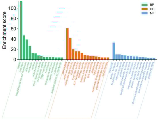 The DEPs were annotated into the GO database, and 319 of the 343 differentially expressed proteins were annotated into the GO database for cellular component, molecular function, and biological process classification. Among the cellular components, cytosol, cytoplasm, an integral component of the membrane, and ribosome were the most enriched, indicating that most biological processes in apple defense occur in the cytoplasm and membrane. The subclasses enriched in molecular functions are ATP binding, metal ion binding, oxidoreductase activity, GTP binding, and hydrolysis activity. This suggests that ATP synthesis, metal ions, and some oxidoreductases involved in oxidation and reduction reactions play important roles in the defense response of apple. The subclasses that were more enriched in biological processes were translation, protein transport, tricarboxylic acid cycle, defense response, and protein folding. The GO enrichment of the differential proteins is shown in Figure 5, where only the top 15 pathways were enriched for differential proteins at three levels of classification.