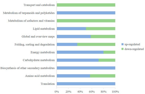 Secondary classification of KEGG functional annotations of DEPs. Blue represents upregulated proteins, and green represents downregulated proteins.