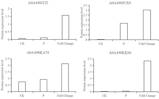 According to the results of the proteomics of apple infected by P. expansum, four proteins were randomly selected and analyzed by PRM. The results showed that the expression of the four identified proteins (A0A498JTJ2, A0A498JUX9, A0A498KA74, and A0A498KKS6) was consistent with the trend of proteomic data, indicating that the proteomic results were reliable (Figure 7).