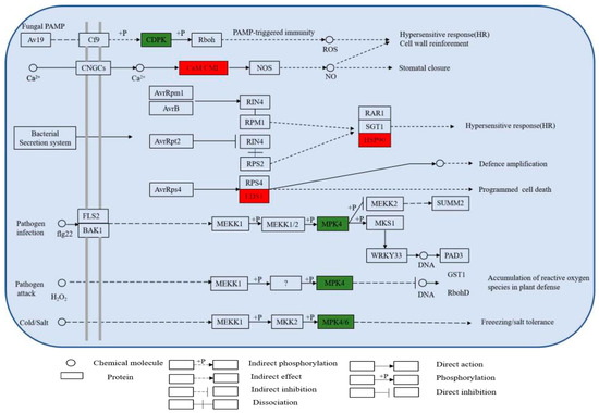 The KEGG metabolic pathway shows that DEPs are involved in several metabolic pathways related to plant defense, including MAPK (plant) and plant–pathogen interactions (Figure 9). The pathway diagram shows that pathogen stimulation causes an increase in the expression of calmodulin and enhanced disease susceptibility 1 (EDS1) and heat shock protein 90 (HSP90), which in turn trigger a hypersensitive response in apple, and the accumulation of EDS1, an important signaling molecule in the regulation of plant immunity, is essential for the subsequent amplification of disease resistance signals during pathogen infection [14]. HSP90 is widely distributed in plant cells and is a molecular chaperone protein); in addition, MPK4 expression, was downregulated at 9 h of P. expansum infection. It has been reported that MPK4 plays a negative regulatory role in plant immunity and can be activated by PAMP [15,16]; Tereza et al. [17] showed that the Gnomon molecular chaperone protein plays an important role in plant stress resistance [17]. The expression of HSP90 was significantly increased in the face of pathogenic infection and may perform an important role in the defense of apple. In addition, calcium-dependent MPK4s play a negative regulatory role in SA accumulation and defense responses but a positive regulatory role in growth and development regulation, and their function is conserved among plant species [18]. CDPK is the largest family of calcium-regulated protein kinases in plants. It rapidly senses changes in transient Ca2+ signals in plants, recognizes and phosphorylates specific substrates, and then triggers various physiological responses through signal cascade transduction, thereby regulating plant growth and development and response to a variety of stresses. ZmCDPK1 negatively regulates the stress response to cold in maize, and the cotransfection of maize leaf protoplasts with ZmCDPK1 inhibited the expression of the cold-inducible marker gene Zmerf3 [19]. CDPK and respiratory burst oxidase homolog (Rboh) are involved in biotic/abiotic stress processes and cell death in plants, and the expression of Rboh plays a key role in the accumulation of ROS, which in turn increases the level of plant defense against pathogens [20]. CDPK expression was significantly downregulated during defense, leading to the hypothesis that CDPK plays a negative regulatory role in the apple defense response to P. expansum infection.