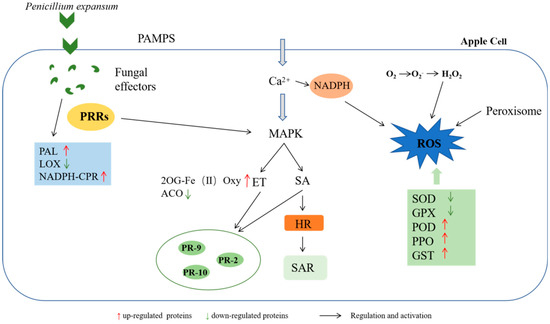 In the present study, the differential expression of many proteins was induced under P. expansum infection, and most of these DEPs were associated with plant defense mechanisms against pathogenic invasion. Proteins associated with biological processes, such as the MAPK cascade, plant–pathogen interactions, the stimulation of metabolite biosynthesis, and amino acid metabolism were significantly upregulated in expression. They are involved in various processes such as reactive oxygen species (ROS) burst and scavenging, hypersensitive response (HR), redox reactions, and defense-related protein induction.