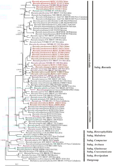 - Chen, B.; Song, J.; Chen, Y.; Zhang, J.; Liang, J. Morphological and phylogenetic evidence for two new species of Russula subg. Heterophyllidia from Guangdong Province of China. MycoKeys 2021, 82, 139–157. [Google Scholar] [CrossRef]